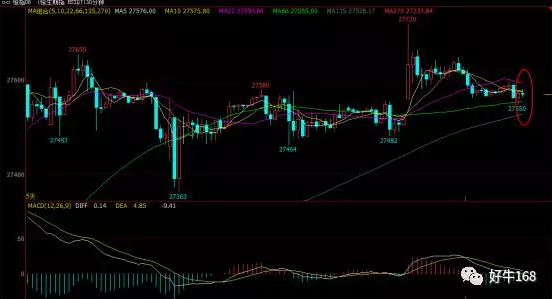 从三十分钟图来看,恒指在27600至27500调整空间进一步被压缩,而日线当中价格触及五日均线附近,且MACD指标动能绿柱进一步放量,价格有进一步回落需求,需注意向下跌破震荡区间,早间建议以区间震荡的方式去操作,空单可在27600附近进场,止损27620,止盈27530;27530附近布局多单,止损27500,止盈27600。
