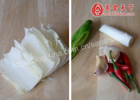 2、白菜帮斜刀切块,尖椒切圈待用;