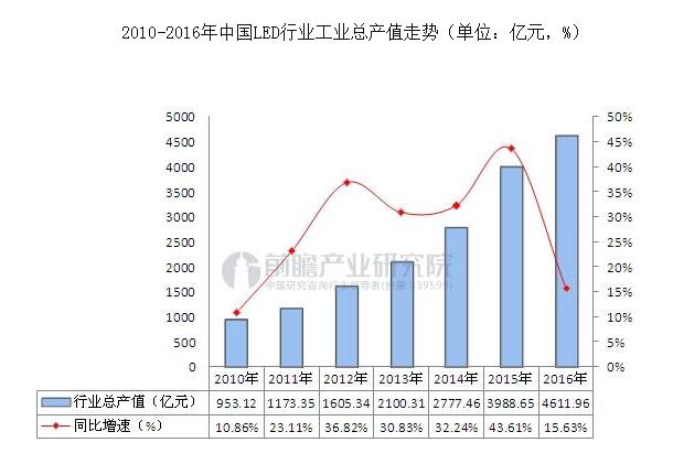 LED企业整体经营效益向好,源于LED产业产销规模的稳定增长。数据显示,2010-2016年,中国LED行业工业总产值呈逐年快速增长趋势,2016年实现工业总产值4611.96亿元,同比增长15.63%。