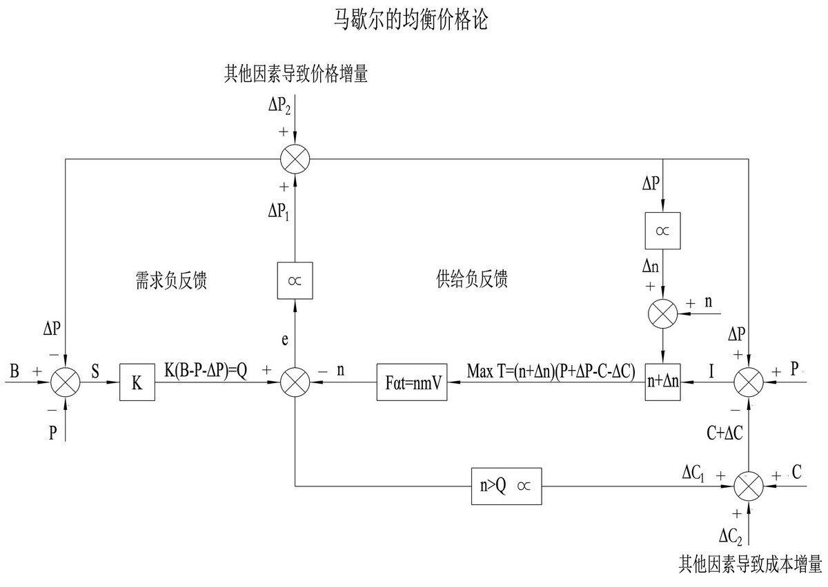 9)均衡:在系统思考中,马歇尔通过均衡论将负反馈理论引入经济学。在价格均衡论中,文中给出了简单和复杂两个版本的供需均衡图形,指出了供需均衡是需求负反馈和供给负反馈两个负反馈作用的合成结果,并且给出了供需均衡的系统思考分析框图(如图4-4所示)。