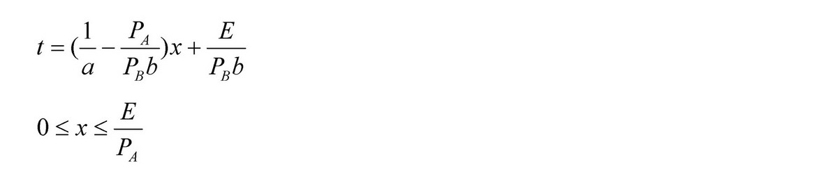 其中,产品A和产品B为互相可以替代的产品,产品A的价格为PA,产品B的价格为PB,时间t天的消费预算为E。如果只消费A产品,每天需要消耗数量为a;如果只消费B产品,每天需要消耗数量为b。购买A产品的数量为x。