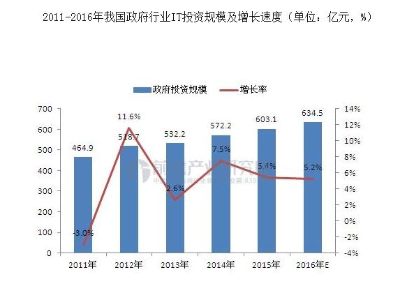 电子政务发展前景与投资战略规划分析报告》测算,2016年政府行业IT投资较2015年增长5.2%,投资规模达634.5亿元。