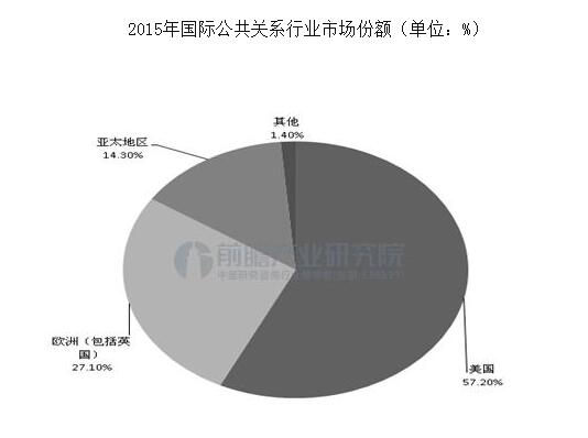 据有关数据统计,2015年,国际公共关系行业的总体规模约107亿美元,年增长率约5%。其中,美国市场约61.20亿美元,占全球的57.2%;欧洲(包括英国)市场约29.00亿美元,占比为27.1%;亚太地区市场约15.30亿美元,占比为14.3%。