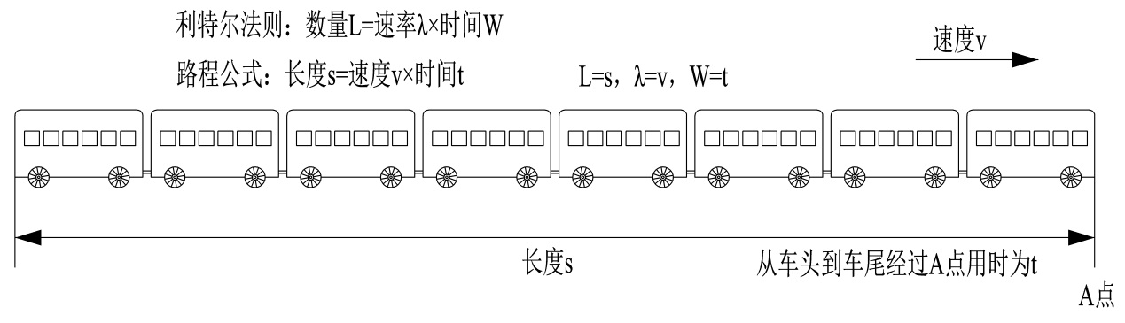 利特尔法则为:在一个稳定的系统中,长时间观察到的平均顾客数量L,等于长时间观察到的有效到达速率λ与平均每个顾客在系统中花费的时间之乘积,即L = λW。对于一个系统来说,恒定的到达速率,并且每个产品在系统花费的平均时间相同,那么相当于每个产品经过相同的时间延迟,便可以从系统中流出,也就是说系统的产出速度和到达速度相同,所以利特尔法则在使用时,很多时候所说的速度是系统产出的速度。利特尔法则论述的是一个排队理论,以火车经过A点来进行类比。火车的长度为s,相当于利特尔法则中排队长度L;火车的速度v相当于利特尔法则中的速率λ,每个顾客在系统中花费的时间W相当于每节车厢在系统中花费的时间t,就是从进入系统到离开系统的时间,这其中包括等待时间。在A点进行观测,火车从车头进入A点到车尾离开A点的时间为t,那么火车长度s可以通过s=vt进行计算(如图6-144所示)。