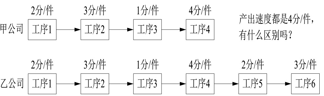 有甲和乙两个公司,都是生产A产品,两家公司的产出速度都是4分钟每件,但是乙公司从投料到产出最小时间比甲公司长,两家公司的产线有什么区别吗?