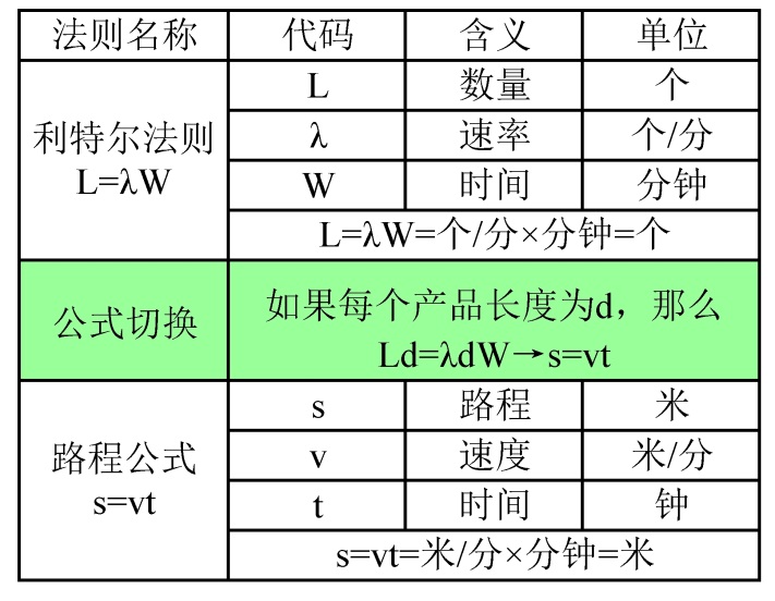 让我们来对比一下利特尔法则和路程公式之间的相似性。利特尔法则L=λW和路程公式s=vt都是A=BC这种形式,并且都有速度这个因素B和时间这个因素C。L的单位是个,s的单位是米。如果利特尔法则中的每个个体的长度为d,那么将利特尔法则左右同时乘以d,得到Ld=λWd,左边是数量个乘以单个长度得到:Ld=个×米/个=米,得到总长度s,单位为米;右边λd=个/分×米/个=米/分=v;而时间W和时间t都是时间,单位为分,只是符号不同。所以Ld=λWd→s=vt。如果将路程公式左右同时除以d,也可以得到利特尔法则(如表6-12所示)。