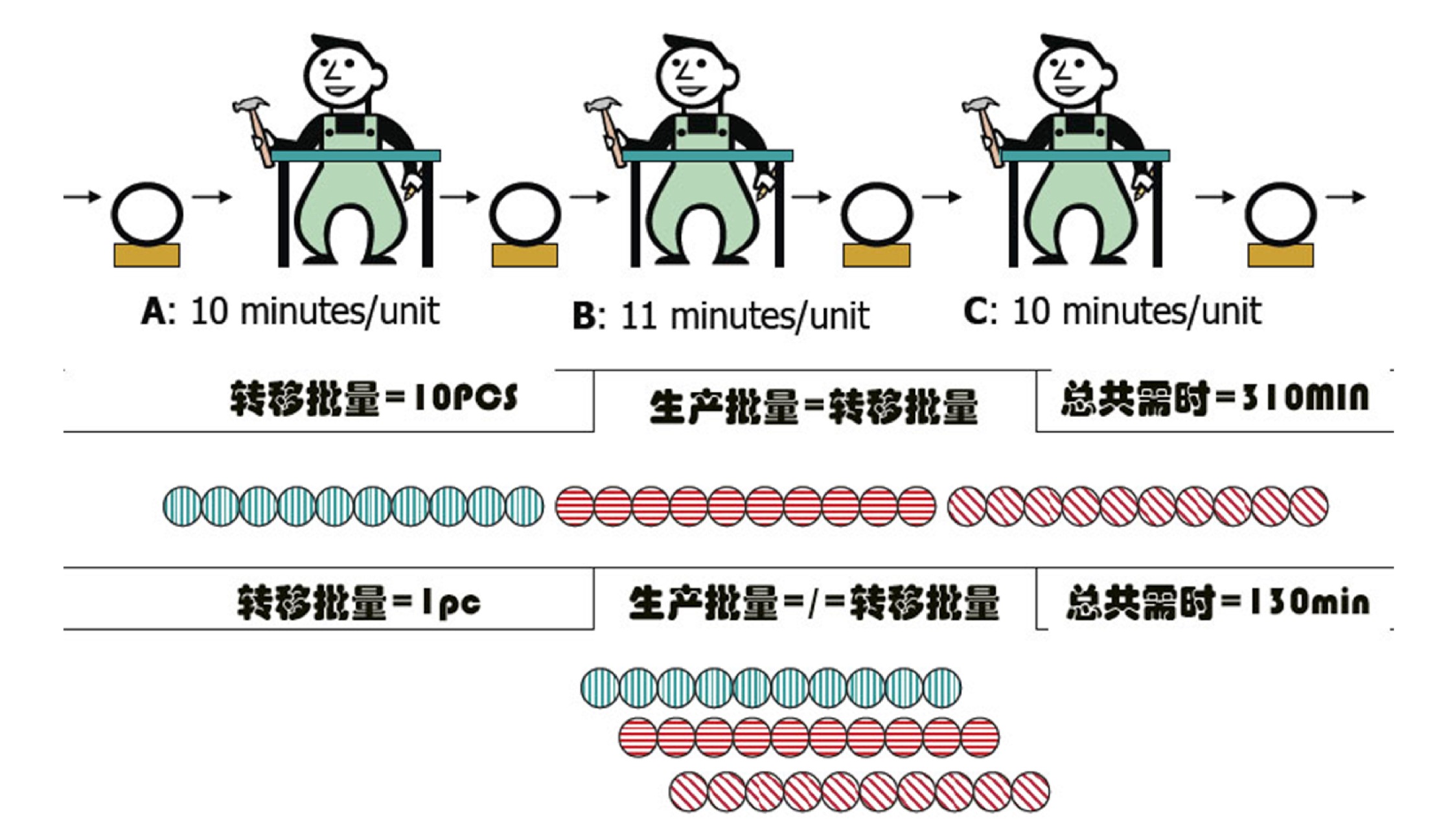我们从福特和大野耐一身上学到的是,不要接受所谓的固定批量。因为经济批量实际上不经济,相反我们应该尽力追求单件流,我们已经深深认识到当我们正在加工一个批量的一件产品时(混合或烘干过程除外),其它的部件都在等待。”我们追求的目标是:改善生产的流动性(等同于前置时间),即追求总工序时间最短。