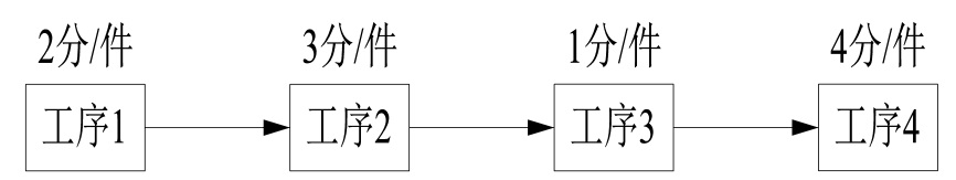 下边我们来推导工序总用时的公式。一个生产流程有4道生产工序,每道工序的速度分别是2分钟/件、3分钟/件、1分钟/件和4分钟/件,工序4是瓶颈(如图6-139所示)。