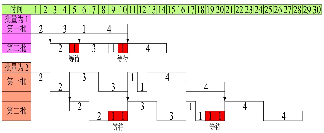 当转移批量为2件,批次为2批时,第一批耗时20分钟。当工序1生产耗时2分钟完成本道工序工作后,工序1接着生产第一批的第2件产品,第一批在工序1耗时4分钟,然后2件同时转移到工序2进行加工。工序2耗时6分钟完成2件产品的加工,然后顺次将2件产品转移到工序3和工序4,第一批共耗时20分钟完成生产。在工序1完成第一批的2件产品后,接着开始生产第二批的2件产品。当工序1完成第二批的2件产品后,工序2正在加工第一批产品,所以需要等待2分钟才能生产第二批。在对应10分钟的时刻时,工序2开始生产第二批产品,在对应时刻16分钟时完成加工,此时工序3已经完成第一批的生产,第二批可以直接进入工序3进行加工。在对应时刻18分钟时,工序3完成第二批的生产,此时工序4正在加工第一批的产品,所以第二批需要等待2分钟才能进行工序4进行加工。两批产品加工一共耗时28分钟。