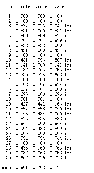 下图即是计算出来的结果,30个项目有4个综合效率都是1 ,那技术效率和规模效率都是1?这个该怎么解释呢?7个规模效率都是1,也是该怎么解释呢?有没有人能够提点一下呀,而且每个项目的技术效率是怎么计算的呀?这个软件怎么通过几个投入产出就能计算出技术效率呢?