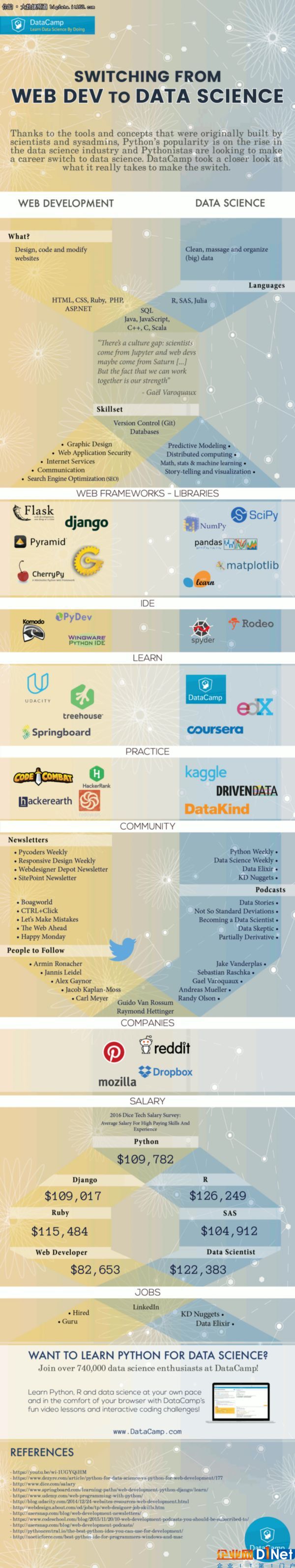 上图中的薪酬数据来自于在线工作网站Dice,他们表示数据科学家的薪酬一般要比Web开发人员多15%,同时这也表明开发者转向数据科学家是非常值得的。