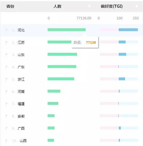 河北的三四线城市看来很活跃的样子,人数有7.7万人,而且TGI也偏高。