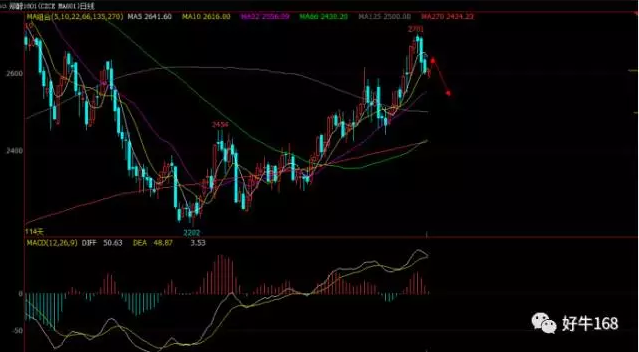 从日线图来看,沥青价格与笔者前期所说的,在上周五晚间形成盘整之势,受到前期一波大跌的影响,均线乖离较大,价格不易于再进一步大幅下跌,而会选择在此点位附近徘徊,等待指标跟上之后,再选择方向。笔者认为后期进一步冲高回落的意图还是比较强的,所以尽量以高空为主最为合适。日内建议:2640附近布局空单,止损2650,止盈2570;2570附近布局多单,止损2560,止盈2600。
