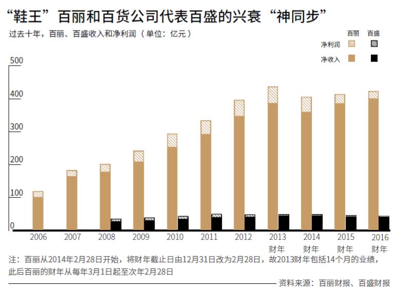 百丽退市前最后一份财报显示,截至2017年2月底,公司总营收为417.07亿元人民币,同比微涨2.25%。鞋类业务销售规模同比下跌10%,内地鞋类零售网点减少700家,鞋类毛利率66.9%,同比下降0.4个百分点。运动、服饰类业务的销售规模提升了15.4%,在整体收入中的占比超过鞋类业务达到54.5%。但由于运动、服饰类业务是代理品牌,百丽不掌控生产供应链,毛利率较低,仅有43.8%。因此未能扭转整体净利润下跌的态势,2016全年净利润为24.03亿元人民币,同比下跌18.09%。