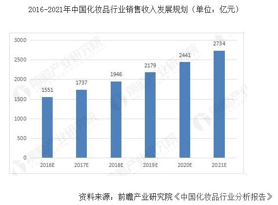 按照当前发展势头,预计在“十三五”时期,化妆品行业销售收入年均复合增速高于10%,以年均复合增速12%计算,到2021年,我国化妆品行业销售收入将达到2700亿元左右。
