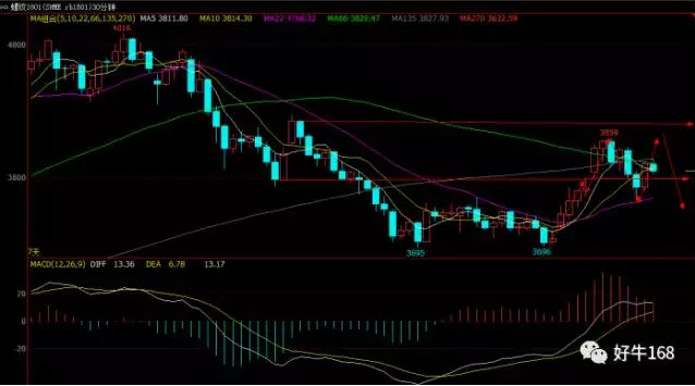 从三十分钟级别来看,螺纹价格反弹触及3860附近开始回落,而三十分钟级别的MACD动能红柱进一步缩量,价格短期内难以形成大幅上涨,若是早间价格进一步走强第一次至3890附近,可以选择布局一次空单,止损3920,止盈3800,早间若是进一步回撤的话,可选择在3765附近布局多单,止损3750,止盈3860附近。