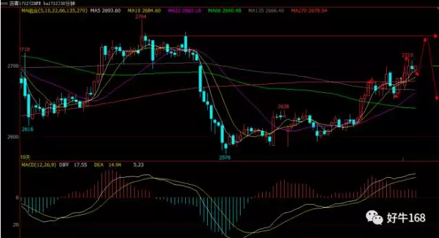 从三十分钟图来看,沥青价格短期均线发散向上,目前价格已经企稳年线上方,价格涨势较强且没有明显转空迹象,价格有冲击前期高点的可能。建议回踩2675附近做多,止损于2660附近,止盈于27300附近。如果价格上探前高位置2740附近可以做空,止损于2760附近,止盈于2680附近。