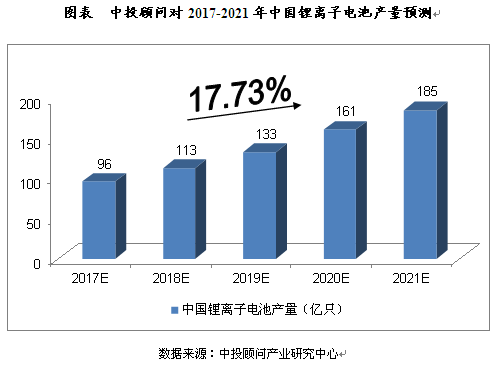 2016年,中国锂离子电池产量为78.4亿只,同比增长35.8%;2017年1-6月,产量达到46.8亿只,同比增长40.9%。中投顾问发布的《2017-2021年中国锂电池行业投资分析及前景预测报告》数据显示:预计,2017年中国锂离子电池产量将达到96亿只,未来五年(2017-2021)年均复合增长率约为17.73%,2021年中国锂离子电池产量将达到185亿只。