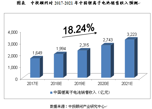 根据中国化学与物理电源行业协会统计分析,2016年中国锂离子电池销售收入达到1,330亿元,同比增长35%。中投顾问发布的《2017-2021年中国锂电池行业投资分析及前景预测报告》数据显示:预计,2017年中国锂离子电池销售收入将达到1,649亿元,未来五年(2017-2021)年均复合增长率约为18.24%,2021年中国锂离子电池销售收入将达到3,223亿元。