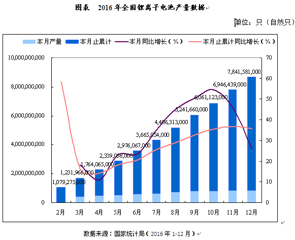中投顾问发布的《2017-2021年中国锂电池行业投资分析及前景预测报告》数据显示:2016年1-12月,全国锂离子电池累计产量为7,841,581,000只(自然只),与上年同期相比增长了35.8%。其中,12月份锂离子电池产量最高,为844,143,000只(自然只),与上年同期相比增长了26.1%;其次是11月份,单月产量为839,605,000只(自然只),与上年同期相比增长了45.6%;最少是3月份,单月产量为443,646,000只(自然只),与上年同期相比增长了18.2%。