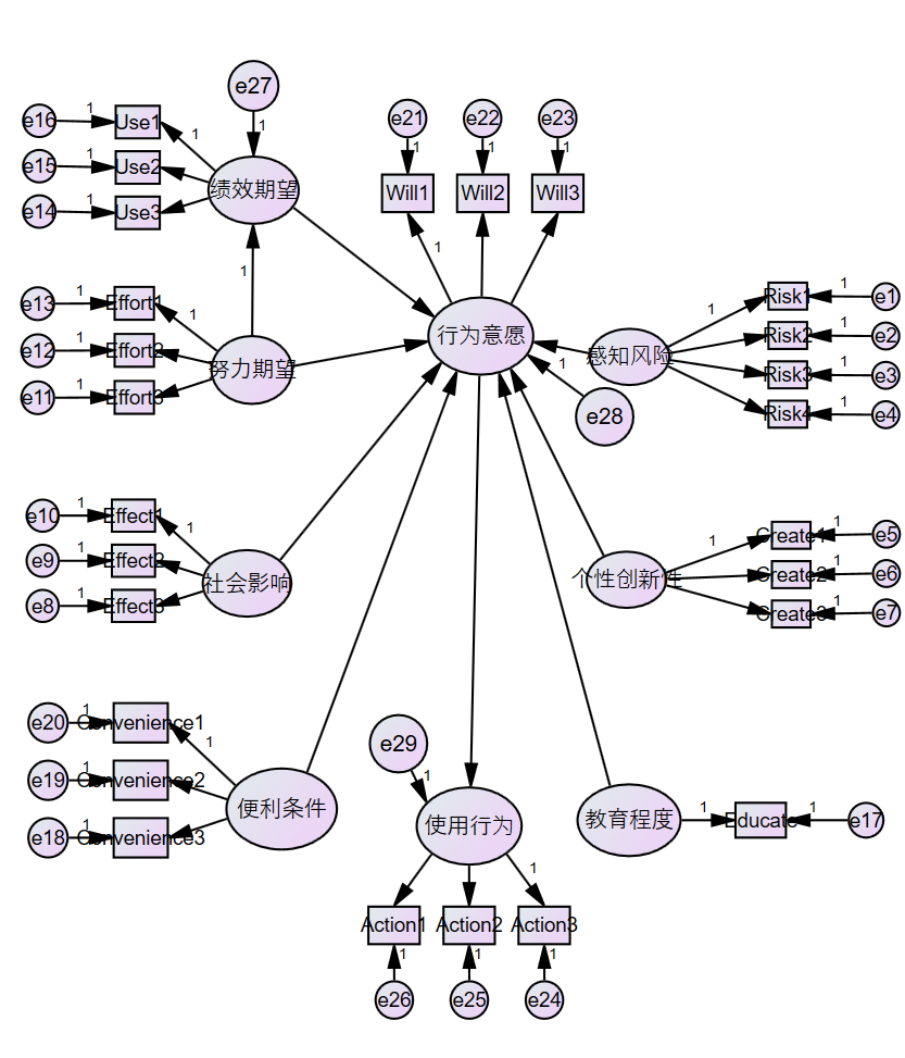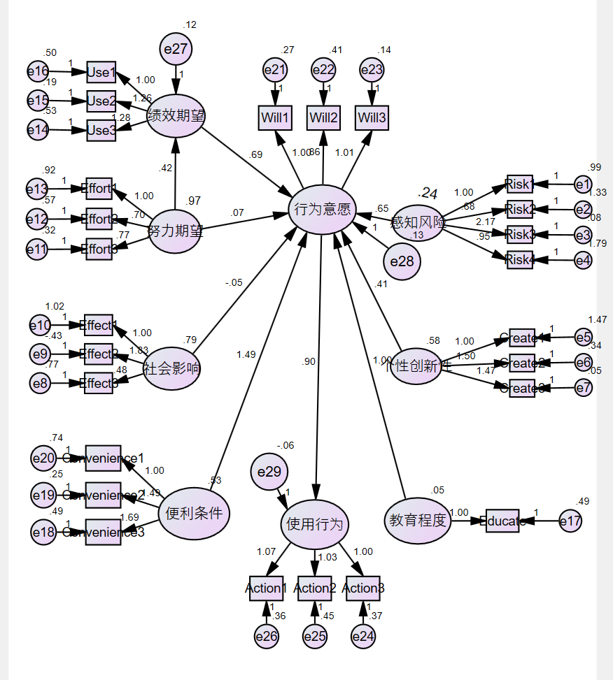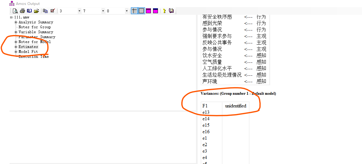之前原本是 it will probably be necessary to impose 5 additional constraint,后来看了论坛,每个潜变量对应的观察变量都设置了固定路径1,现在需要impose 1 additional constraint,但实在不知该怎么修改了?请各位大佬帮我看看,顺便指出下我的模型有啥问题。谢谢!