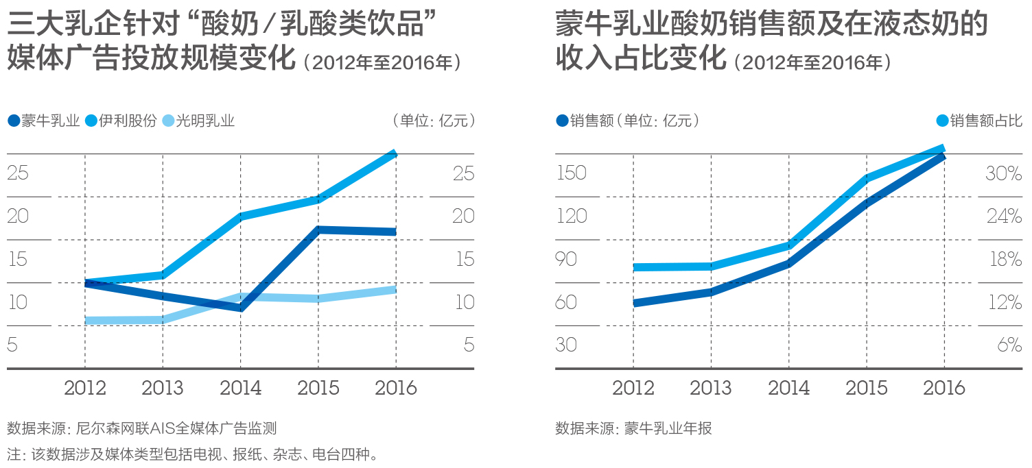 据尼尔森网联AIS全媒体广告监测提供的数据,2016年伊利针对酸奶和乳酸饮料产品在电视、报纸、杂志、电台4种类型媒体的广告投放金额达到25.2亿元,已经超过其他两家针对同一细分市场的广告投放总和,而3家企业去年在上述媒体的广告投放,累计已经超过了50亿元。