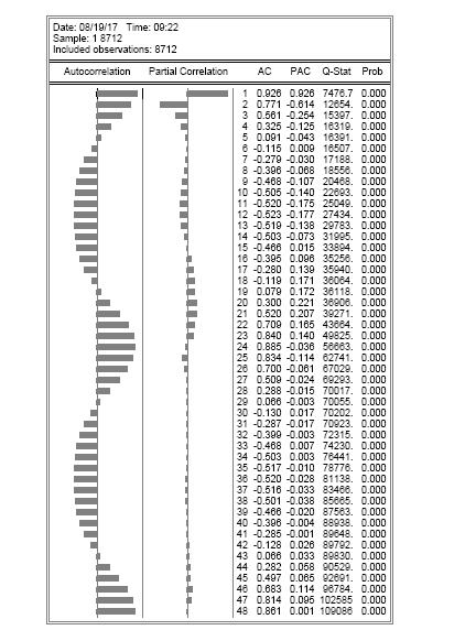 本人初学Eviews,最近在学习太阳能序列预测,序列如图1所示。首先计算了序列的ACF和PACF如图2所示发现,其ACF呈现正弦形式,而其PACF缓慢的衰减至0。这里,我有几个困惑的问题想请教大神们,(1)从ACF图看的话,序列是平稳序列还是非平稳序列?(2)如果是平稳序列,如何判断其AR(p)的模型?谢谢大家了,这个问题困惑好久了,查了一些资料依然没有得到有效的解决,谢谢啦!