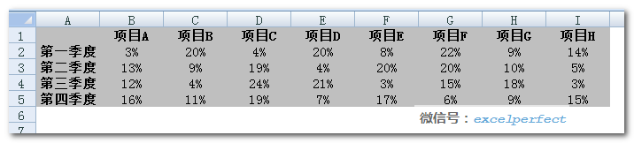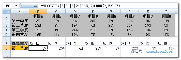 然后向右拉至单元格I8,查找到与A8中季度相对应的数据,如下图所示: