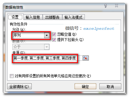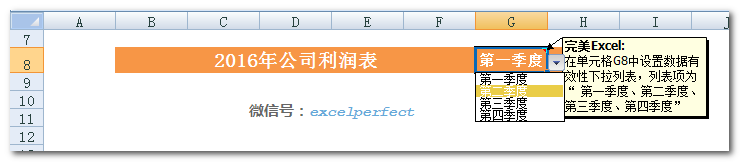 首先,在单元格G8中设置数据有效性下拉列表,下拉项为“第一季度、第二季度、第三季度、第四季度”,如下图所示: