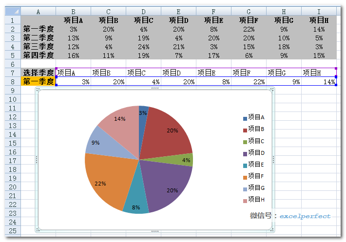 至此,图表制作完成。在单元格G8的下拉列表中选取相应的项目后,饼图会自动调整。