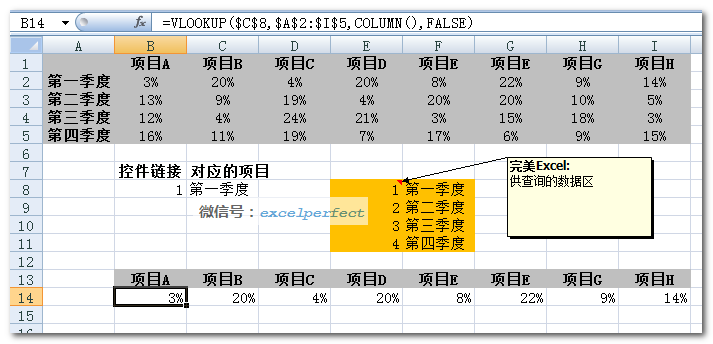 将其向右拉至单元格I14,以查找与单元格C8中的季度相对应的数据。