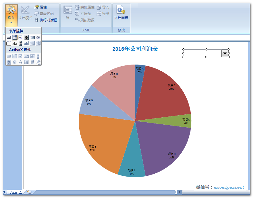 选择单元格区域B13:I14,单击“插入”选项卡“饼图”,插入一个饼图,然后将其移至新的图表工作表中,并插入一个组合框控件,如下图所示:
