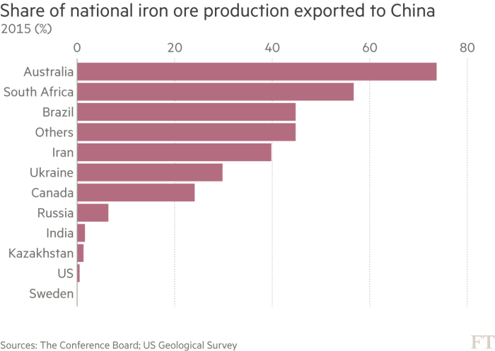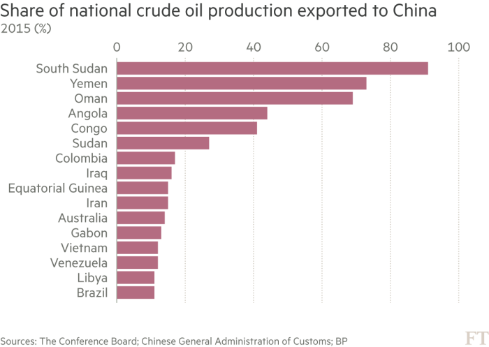 China is the world’s biggest importer of food and energy, buying about 20 per cent of global exports in both sectors. It is also the dominant customer for many small, energy-rich nations. In 2015 China purchased 40-90 per cent of the crude oil produced by Congo, Angola, Oman, Yemen and South Sudan.