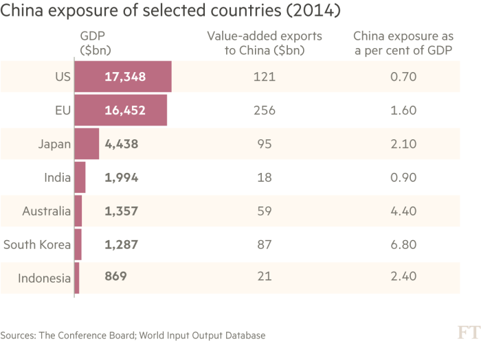 Notable exceptions include South Korea and big natural resource exporters such as Australia, whose value-added exports to China are equivalent to 6.8 per cent and 4.4 per cent respectively of their annual economic output. Beijing has used its economic leverage over Seoul in an attempt to prevent the deployment of a US anti-missile system.