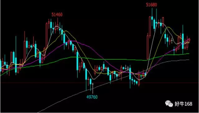 从小时图来看,铜价在大幅拉升之后,市场恐高震荡回落。目前价格受到季线位置支撑,近期价格恐还将上探前高位置。建议回踩50650附近做多,止损于50550附近,止盈于51300附近。同时价格上探51800附近做空,止损于51950附近,止盈于51000附近。