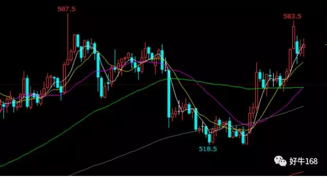 从小时图来看,铁矿经过一段深度调整之后,价格再次上涨至前高位置附近,目前走势强劲且有高位蓄力的迹象,预计日内还将上探一波。建议价格回踩560附近可做多,止损于556附近,止盈580附近。同时价格上探590附近可以做一次回踩空,止损于592附近,止盈于580附近。