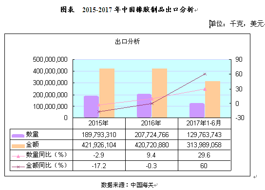 2015-2016年,我国橡胶制品出口总额由421,926,104美元下降到420,720,880美元,下降了0.3%;2017年1-6月,我国橡胶制品出口总额为313,989,058美元,比上年同期增长60%。