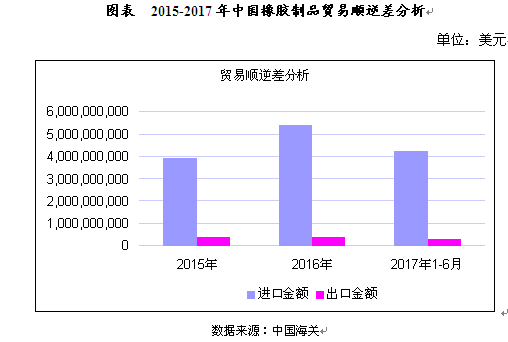 从图中可直观看出,2015年,我国橡胶制品进口总额大于出口总额,贸易逆差;2016年,我国橡胶制品进口总额大于出口总额,贸易逆差;2017年1-6月,我国橡胶制品进口总额大于出口总额,贸易逆差。