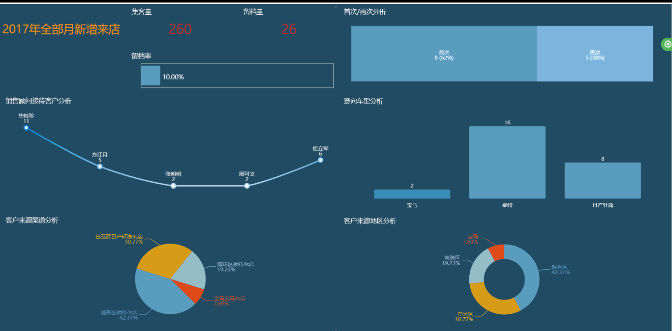 在汽车销售行业里,如果一个顾客给销售顾问留下了联系方式,并且多次回访的情况,那么这个客户的的购买意向就是非常的明确了,应作为一个重点跟进的客户。在汽贸行业数据分析中新增来店分析就是统计分析这样的一种情况。其中集客数就是到店的顾客数,留档量就是登记建卡留资料的顾客数,这个比例的越高表明销售顾门的服务到位,顾客愿意接收销售顾问的推荐信息。而右上角的首次再次到访的百分比图统计分析首次到访与再次到访顾客的比例。当再次到访的客户更多时成交的机会也会更多。同在在报表下展示了销售顾问的接待人数,意见车型及客户来源的统计分析。新增来店分析报表统计分析了到访顾客的情况,同时也体现了销售顾问的服务情况。同时可在报表的右侧可以打开筛选面板筛选不同的时间段以统计分析不同时间段顾客来访的情况。