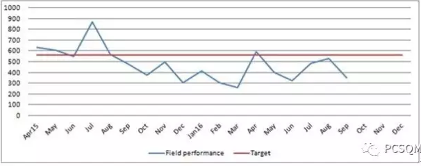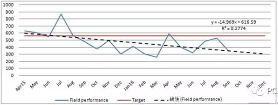该图是某个产品指标在最近两年内每个月变化的趋势。图形能给出一个主观感受,尤其是加入目标线后,能知道产品指标是否符合要求,其趋势是上升(恶化)还是下降(优化)。