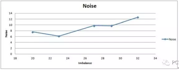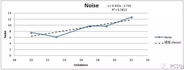 该图是某产品的不平衡度与噪音的关系,理论分析已经告诉我们,不平衡度是造成噪音的一个影响因素。通常情况下,不平衡度越大,噪音也会越大。为了验证理论,收集了几组数据做出该图,通过趋势线能看出,的确不平衡度增大,噪音也随之增大。