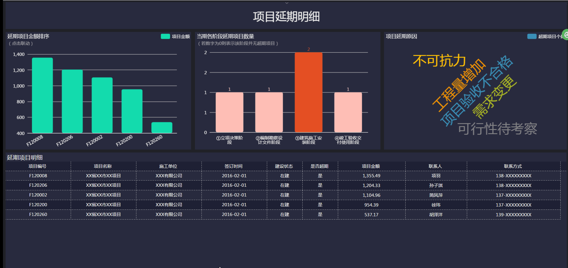 (4)点击延期项目可联动其他图表,能了解项目延期的具体原因;