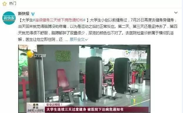 当大家都在关注思考甩脂机的危害时,殊不知西安一位叫小赵的小伙子,在健身三天后被医生下达了病危通知书。(8月22日华商经报)