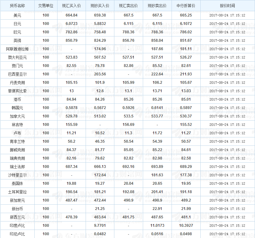 中国银行外汇牌价 2017-08-24(图片来源:东方财富网)