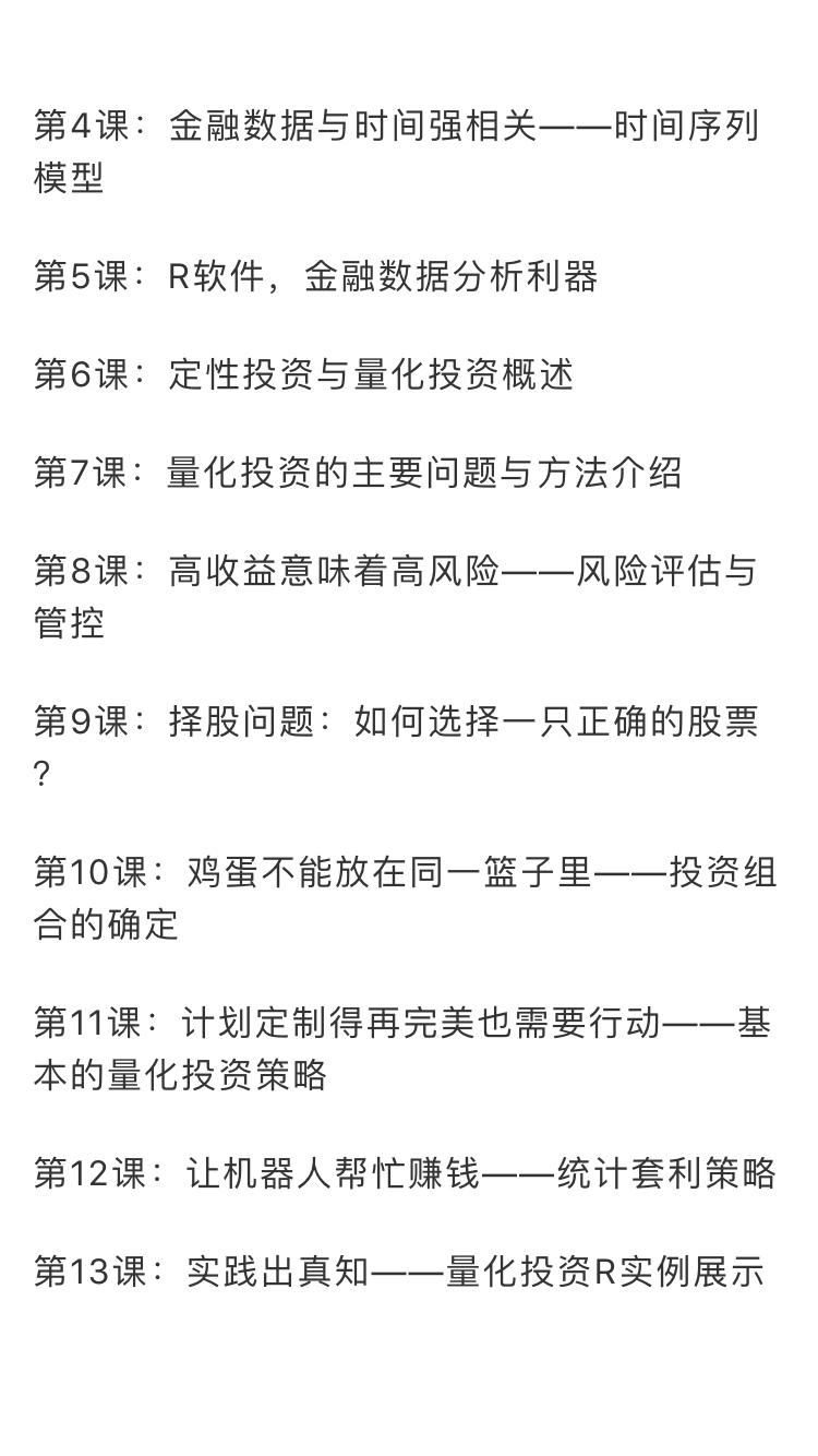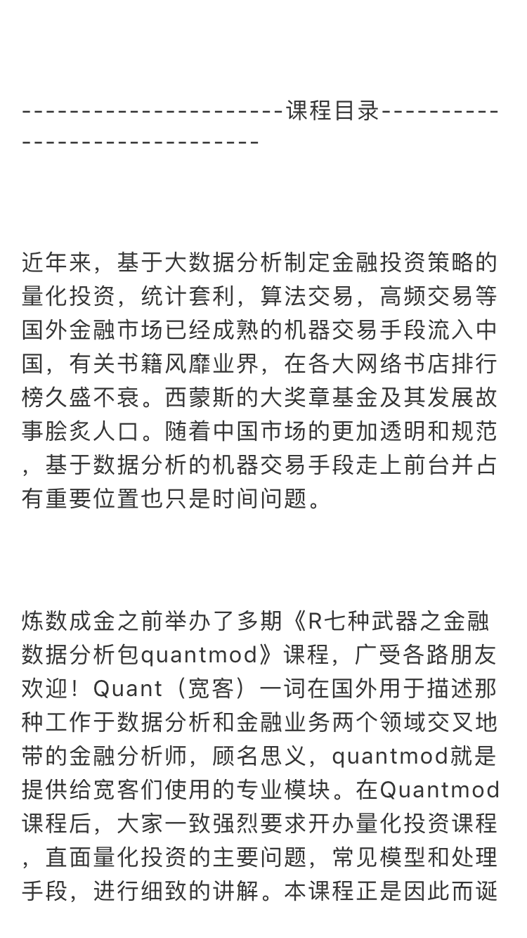 炼数成金之前举办了多期《R七种武器之金融数据分析包quantmod》课程,广受各路朋友欢迎!Quant(宽客)一词在国外用于描述那种工作于数据分析和金融业务两个领域交叉地带的金融分析师,顾名思义,quantmod就是提供给宽客们使用的专业模块。在Quantmod课程后,大家一致强烈要求开办量化投资课程,直面量化投资的主要问题,常见模型和处理手段,进行细致的讲解。本课程正是因此而诞生。学习者可以通过本课程,了解量化投资金融数据分析的基本问题和目标,掌握术语,模型和分析技巧,步入这个金领云集的高收入领域,也为后续的更深入的金融建模课程奠下基础,成为变身宽客的敲门砖。
