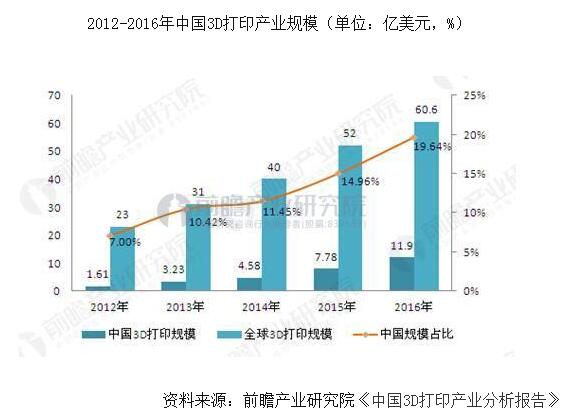 可见,我国虽为3D打印行业的后起之秀,但研发能力和应用前景发展势头迅猛。受此影响,国内3D打印产业市场规模增长飞速,已由2012年的1.61亿美元增至2016年的11.9亿美元,在全球市场规模的比重则相应地由7%升至19.64%。