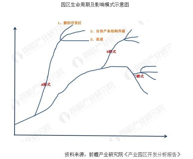 园区也会经历初创、成长、成熟和衰退的过程,然而产业园区发展与城市经济发展紧密相连,其的命周期也可以因城市经济的影响而发生变化,如下图所示:例如A模式下,产业园区在成长或初创期根据城市的发展,开始延长其生命周期,最后走向三种情况:一是成为新的开发区继续延长生命周期;二是产业结构升级;三是进入衰退。