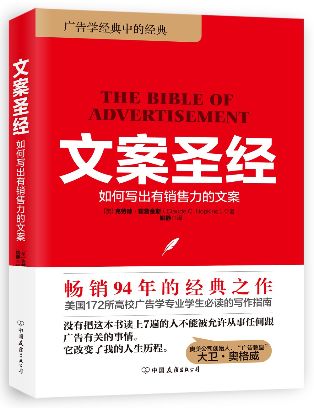 【推荐理由】◎ 克劳德•霍普金斯是现代广告的奠基人,被世界顶级广告公司奥美广告创始人大卫•奥格威视为创造现代广告的六大巨人之一。◎ 克劳德•霍普金斯作为著名广告人,1908年的年薪已经达到18.5万美元(相当于今日的1730万美元),这还不包含他所获赠的股票价值。霍普金斯一生只对广告感兴趣,在41岁时,他加入了著名的洛德暨托马斯广告公司,为其撰写广告文案。当时他的年薪达到18.5万美元,霍普金斯在这家公司供职了18年,最后从董事长兼总经理的职位上退休。◎ 他在广告方面的每一个创举,比如优惠券、测试营销、文案调查、邮寄营销和免费试用等,都是围绕广告的效果来进行的。正是霍普金斯把广告变成了一门科学,摆脱了广告的盲目性。◎ 由于霍普金斯在广告业的卓越贡献,他被美国第29任总统哈丁总统延揽入阁,被任命为美国航运局主席。◎ 此书为广告学史上的经典之作,畅销94年,美国172所广告院校指定必读之书。◎ 全球顶级广告公司奥美广告创始人大卫·奥格威要求奥美人必读的7本书之首。大卫·奥格威:“如果不把这本书读上7遍,任何人都不能去做广告。霍普金斯改变了我的一生。”