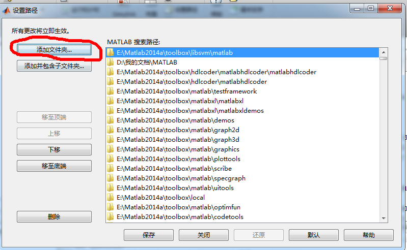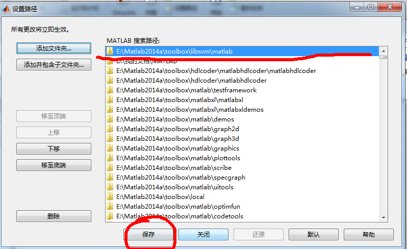 最后的添加文件夹路径一定是E(或其他盘): MATLAB\R2014a\toolbox\libsvm\matlab