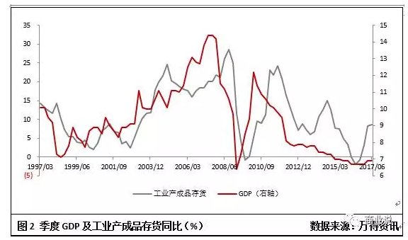 以工业产成品库存衡量,从去年年底到今年年初,配合工业去产能,中国经济经历了从主动补库存到被动补库存的过程,并直接支撑了一季度以来到二季度的较高速度经济增长(图2)。虽然季度累加数字仍然呈现出库存上升的趋势,但从月度数据来看,进入4月份以来,库存周期已经驶入被动去库存阶段,意味着库存周期开始下行。由于库存周期是经济周期的滞后指标,库存周期并不能预测周期拐点,智能确认周期拐点已至。但是由于我国库存数据为月度数据,经济数据为季度数据,因此月度库存周期的拐点,给季度数据尚且向好的经济周期敲响了波动向下的警钟,确认了短周期内,中国经济“小阳春”的逐步结束,以此推断,预计三、四季度经济增长率将略低于一、二季度。
